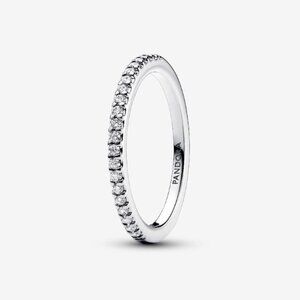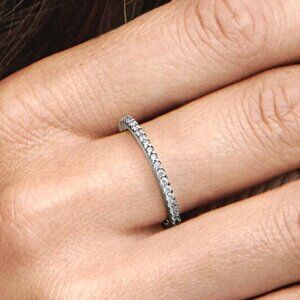 This sterling silver ring is set with a row of clear cubic zirconia. The pavé row sparkles from the outer front half of the band