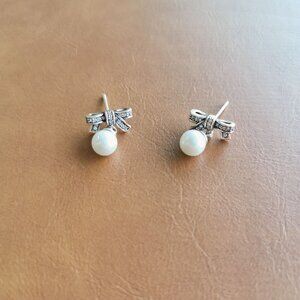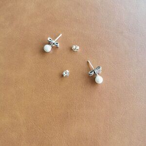 Pandora Sparkling Bow Silver Pearl Earrings Trendy