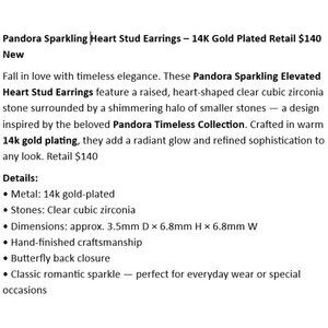 Pandora Sparkling Heart Stud Earrings – 14K Gold Plated Retail $140 New, with tags, in original plastic
