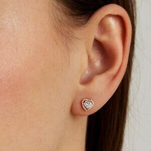 Fall in love with timeless elegance. These Pandora Sparkling Elevated Heart Stud Earrings feature a raised, heart-shaped clear cubic zirconia stone surrounded by a shimmering halo of smaller stones — a design inspired by the beloved Pandora Timeless Collection. Crafted in warm 14k gold plating, they add a radiant glow and refined sophistication to any look. Retail $140