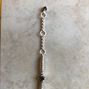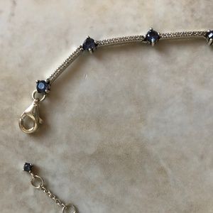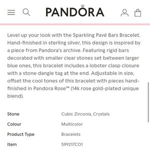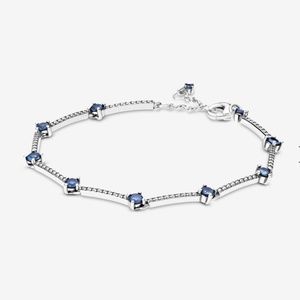 Sparkling Pavé Bars Bracelet is hand-finished in sterling silver, this design is inspired by a piece from Pandora’s archive. Featuring rigid bars decorated with smaller clear stones set between larger blue ones, this bracelet includes a lobster clasp closure with a stone dangle tag at the end. Adjustable in size. Total Pandora size is 7.1