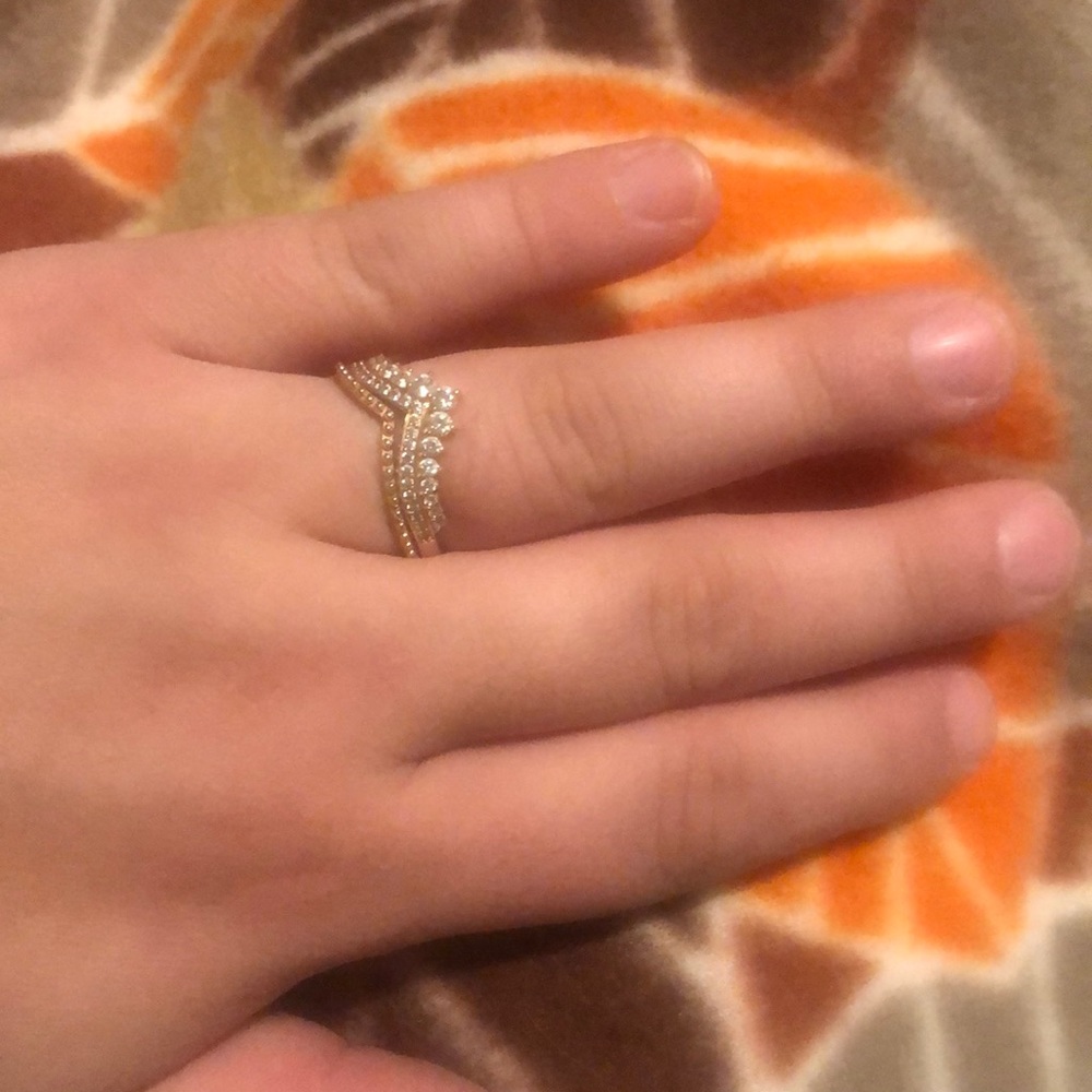 Size 9. Our popular wishbone ring gets a royal makeover with the princess wishbone ring in Pandora Rose™ featuring a tiara design. Made with smooth and sparkling surfaces in rose gold hues, it's every princess' dream with its wishbone shape and tiara look achieved by layering individual crystals onto the band of the ring as well as setting them on its edge. This PANDORA Rose™ chevron ring is given a stylish update thanks to its tactile beaded texture.