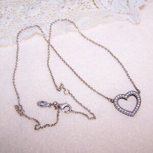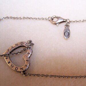 From Pandora, here's a Sterling Silver pendant necklace. At the bottom is a small cubic zirconia filled heart measuring 5/8" wide x 9/16" high; length of the chain is 16". Weight is 3.7 grams. Condition is perfect with a vintage patina to the silver. Lobster catch closure - original Pandora hang tag. Just too cute!