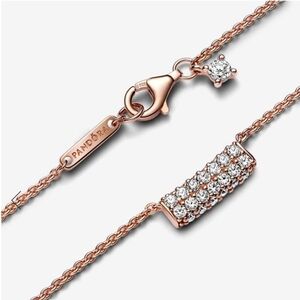Maximize your full sparkle potential with the Pandora Timeless Pavé Double-row Bar Collier Necklace. This versatile piece features a curved bar pendant fixed to the chain with a geometric finish and a double row of sparkle, enhanced with extra rows of stones that face outwards on each side. Add a warm glow with our 14k rose gold-plated finish that offsets the three-dimensional sparkle. Adjustable to two lengths, wear this piece as a statement on its own or layer with more styles for a bold look.