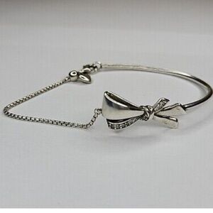 This exquisite gold bracelet from Pandora features a delicate bow design, offering a touch of elegance and charm. Crafted with precision, its smooth and polished finish enhances its sophisticated appeal, making it a versatile accessory for any occasion.
