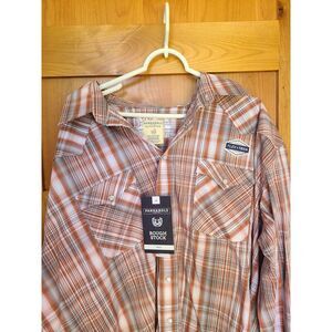 Brand new with tags. Orange and white plaid shirt with pearl snaps.