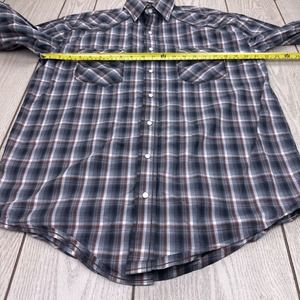 This Panhandle Rough Stock shirt is perfect for any occasion, whether you're dressing up for a party or just looking for a casual everyday outfit. The collared neckline and button-up closure give it a classic look, while the plaid pattern and western themed accents add a touch of personality. Made with lightweight and easy care cotton fabric, this shirt is perfect for all seasons, and features short sleeves and chest pockets for added convenience. The size M shirt is machine washable and fits regular, making it a great addition to any wardrobe. Its gray color and pearl snap closures make it a versatile piece that can be paired with various bottoms. This shirt is a great choice for those looking for a comfortable and stylish option without having to worry about the condition of the item.
