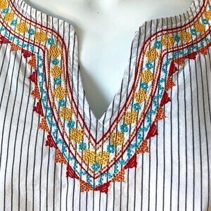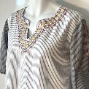Black and white striped with bright embroidered details at neckline and on sleeves