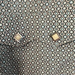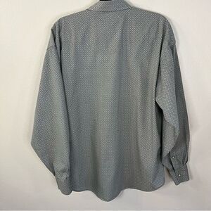 Panhandle Shirt. Men’s. Diamond Pearl Snaps down front, cuffs and pockets. Long Sleeve. Size Large. Geometric pattern in blue and cream. The color combination makes the overall color appear green. Good condition.