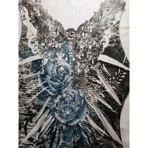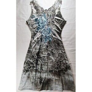 Channel effortless boho charm with this Panhandle Slim Sleeveless Dress in size Small, featuring a striking mix of floral and abstract prints in shades of blue, black, and white. The lace back detail adds a romantic touch, while the sleeveless cut and soft fabric offer comfort and style.