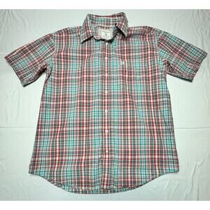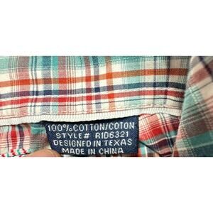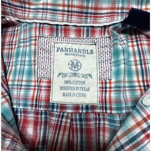 This Panhandle Slim men's shirt features a blue and red plaid pattern with a collared neckline and button closure. It is made of a comfortable blend of polyester and cotton, making it perfect for any occasion such as travel, work, or casual outings. The shirt is designed with a regular fit and slimming features, and has short sleeves that make it suitable for both winter and summer seasons. The shirt is a part of the Panhandle Rough Stock product line, and has button accents and a button-down collar style. It is available in size M and is not handmade or vintage. This Western-themed shirt is an ideal addition to any wardrobe, and its quality is guaranteed as it is manufactured in China.