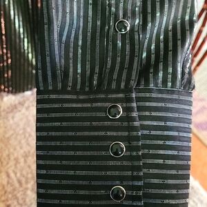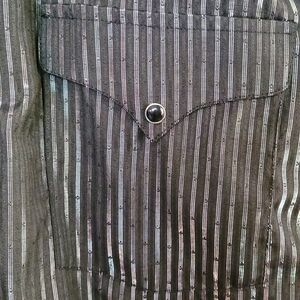 NWOT Black with silver thread stipes. Black pearlescent snap closure. 2 Breast pockets with flap and snap closure. Cuffs are snap closure as well.