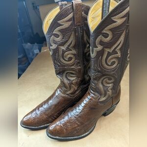 Panhandle Slim men's size 9D Exotic Genuine Brown Ostrich Leg leather classic Western cowboy boots. Ostrich pulls. Repair on sole and heels. See pics.