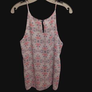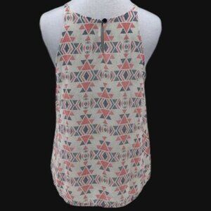 This Panhandle sleeveless blouse features a vibrant geometric print, ideal for adding a touch of modern style to your wardrobe. Designed for comfort and elegance, it's versatile for a variety of settings. The lightweight fabric ensures breathability while the bold pattern enhances visual interest.is in great condition from smoke and pet free home.C.0432