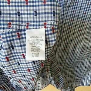 Stylish blue plaid sleeveless shirt with button-up front. Features a contrasting dark blue yoke and two chest pockets.