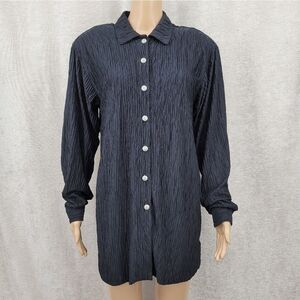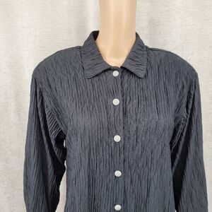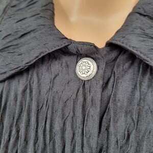 Stylish black textured button-up shirt with long sleeves. Features a classic collar and silver toned patterned metal buttons.