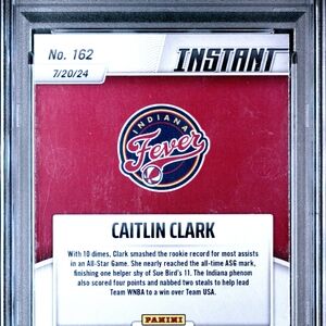 Elevate your collection with this authenticated 2024 Panini Instant WNBA Caitlin Clark Rookie Card (#162). This card commemorates Clark’s historic All-Star Game performance on July 20, 2024, where she smashed the rookie record for most assists (10 dimes!).