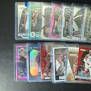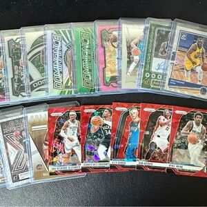 Diverse set of Panini trading cards. Features vibrant designs and player images. Ideal for collectors.