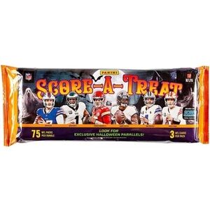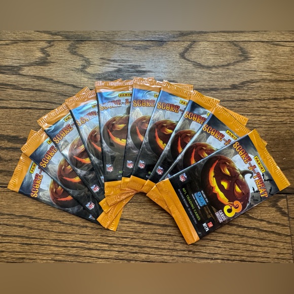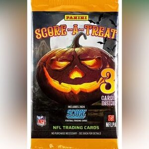 Panini Score-a-Treat football trading cards—10 packs of 3 cards each, 30 cards total—new/unopened. Look for exclusive Halloween parallels.
