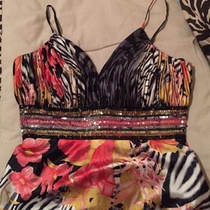 Worn a few years ago for prom. Alterations made to close deep cleavage. Nothing has been cut on this dress. Few snags around bust but not noticeable due to design. Selling for cheap due to age and snags. Beautiful gown in person! Comes from smoke free home.
