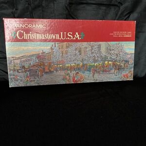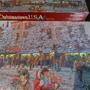 Panoramic Christmas Town USA, 700 piece puzzle of vintage Christmas scene by Springbok, Christmas scene design by Art Carlson, measures 13” x 40” assembled, no missing pieces, box and puzzle in very good condition.