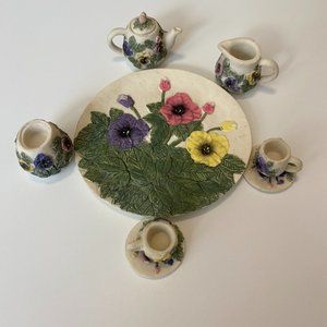 Vintage Miniature Tea Set Pansy Design Made of Resin 9 Pieces 1995 Young's Inc.