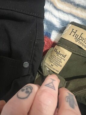 Hybrid & Company olive green pants pictured next to black fabric. Brand label visible on waistband. Simple, versatile styling.