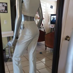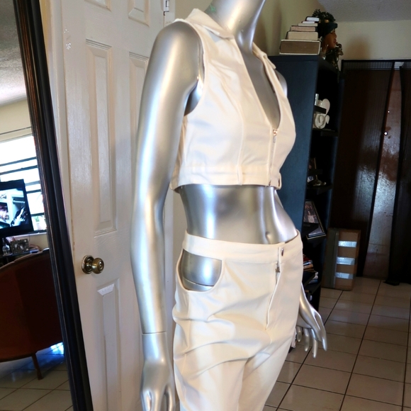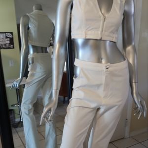 faux leather pant set with one cut out on pants. short cropped vest.