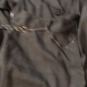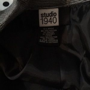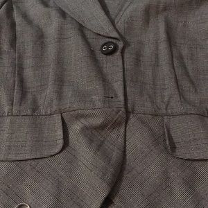 Gray plaid with silver running through it. Jacket has a peplum look to it chain belt with pants jacket is size x large pants are size 12