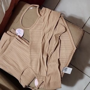 Brand new with tags, taupe color, size medium, stretchy material. 2 piece set. top is tank with tie back. open to offers