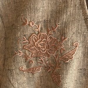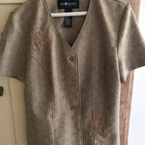 Two piece pant suit with back elastic and side zipper in the pants. See close up of application for better color.