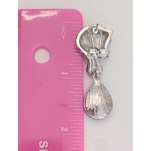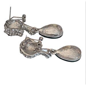 This lovely pair of earrings can elevate any look. It has a distinctive design, crafted from a silver-tone base. Each earring has an elegant panther design. The head is delicately adorned with clear and black rhinestones, that depict the Panther's color scheme. Dangling below is a teardrop-shaped blue-green faceted lucite crystal. Each earring measures approximately 1.75 inches in length. It has a lever back closure, secures the earring to clasp close completely at the back, and remains safely fastened to the ear.