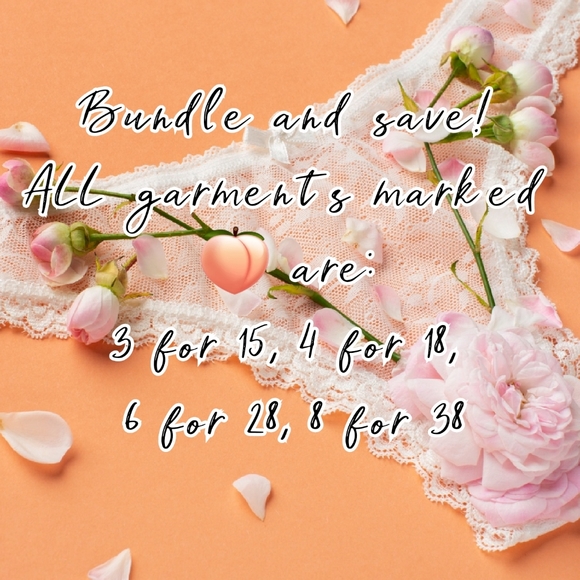 Bundle and save! ALL garments marked with 🍑 are: 3 for 15, 4 for 18, 6 for 28, 8 for 38