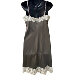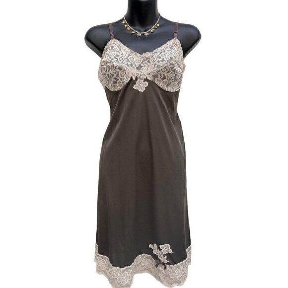 Gorgeous and rare, vintage, 1960s mocha brown, satiny soft, slip dress. Beautiful and delicate ivory lace on the bodice and bottom trim. Semi sheer body. Scalloped lace hem. Bodice is lined and sheer. Adjustable ribbon straps. Delicate satin bow detail on the bottom. One small slit on left bottom hem. Knee length. This has vintage sizing . I estimate it for a modern size 10. Please see measurements listed below.
