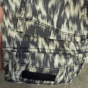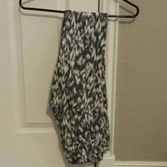 I love these Express pants in this fun print! They fit low the waist and skinny throughout the leg. They are a little long on me (I'm 5'1), but look great with heels. Flattering around the hips and butt.