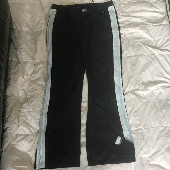 Nike navy blue pants with light blue and white stripes. Zipper and snap fly and also has a draw string. 100% cotton.