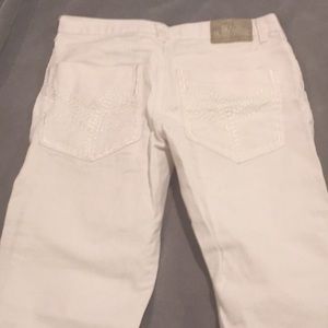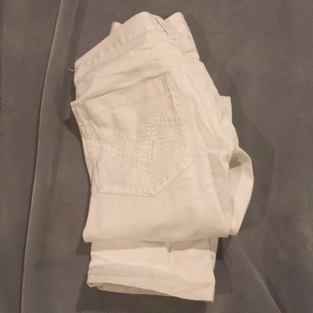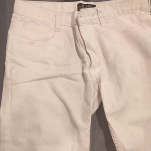 All white jeans! Like a stain here and there Very comfortable and fit well 100% cotton Made in Pakistan Machine wash cold