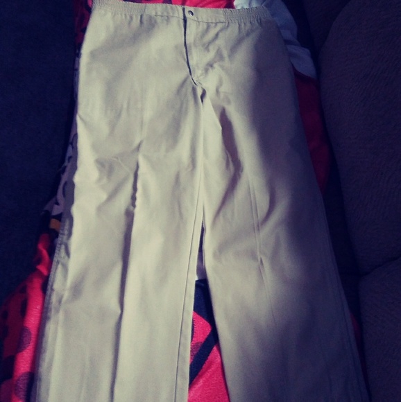 2 side pockets & 1 in the back..zippered front..slightly elastic. Waist to bottom 37"..inset 25"..hips 21 1/2"...Khaki color.