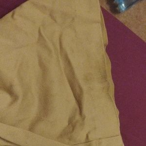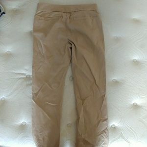 Khaki boot leg pants with slight staining at bottom hem of each pant leg and wear marks in thigh area.