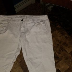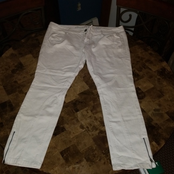 White jean ankle pants with cool hem designs on front and back of pants. If need more pics always ask. I'll be happy to send whatever you'd like.