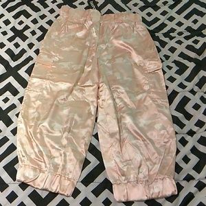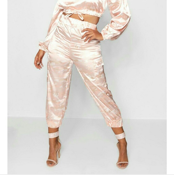 Plus Stefflon Don Satin Camo Crop Cargo Trousers/Capris. Blush/pink color, elastic at the waist and calf.