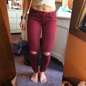 Crimson colored ripped pants. Low waisted.