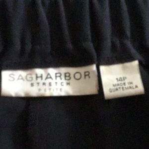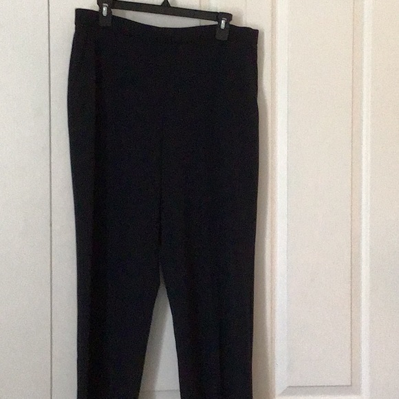 Side pockets elastic waistband in back flat in the front. 63% polyester 33% Rayon 4% Spandex. Machine Washable.