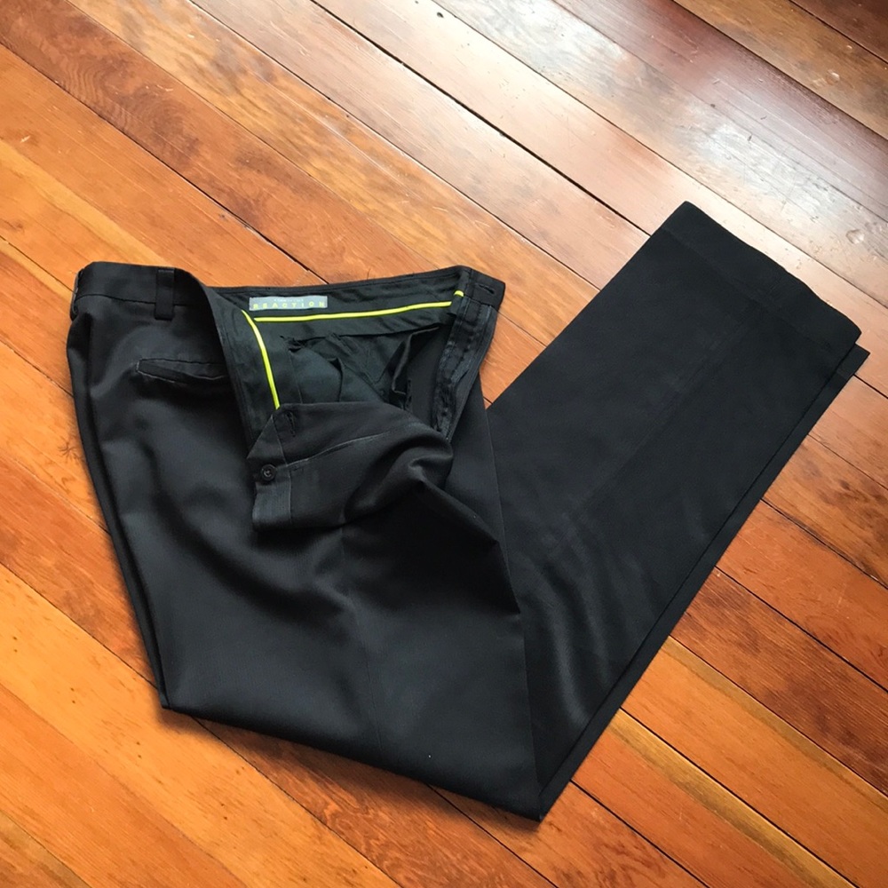 @kscoutt no flaws, but they have been dry cleaned several times. Not sure if exact material mix, but certainly polyester or rayon blend.
