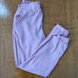 Dark pink fancy pants. It’s flowy. It has elastics around the ankles, and it has pockets. Supper simple