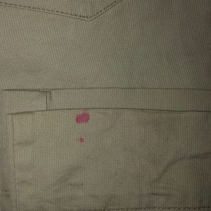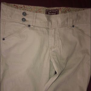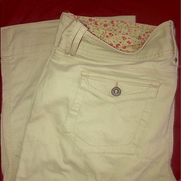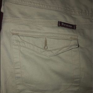 Great pants that are comfy and flattering, not corduroy but looks corduroy, thinner than corduroy...junior size 10/12. Great condition but has a missing button on back pocket and a small pink marker stain on bottom trim, looks more noticeable than it really is..purchased at kohl’s.