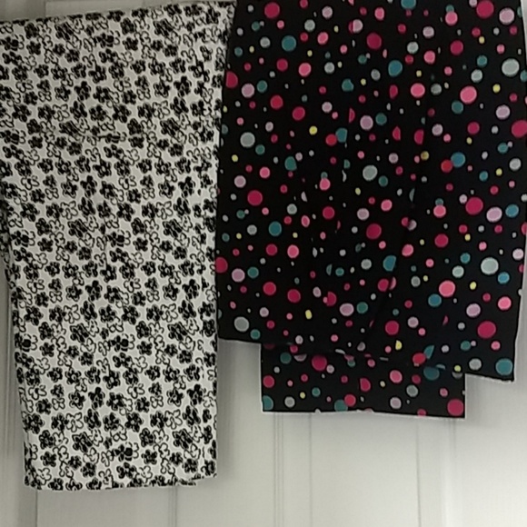 One pair black and white flowers, one pair black & red polka dots, straight legged ankle length