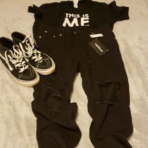 Brand new black destroyed jeans. You can rock it with a cute graphic tee or a sexy bodysuit. Add this perfect piece to your closet for those jeans Friday at work.