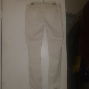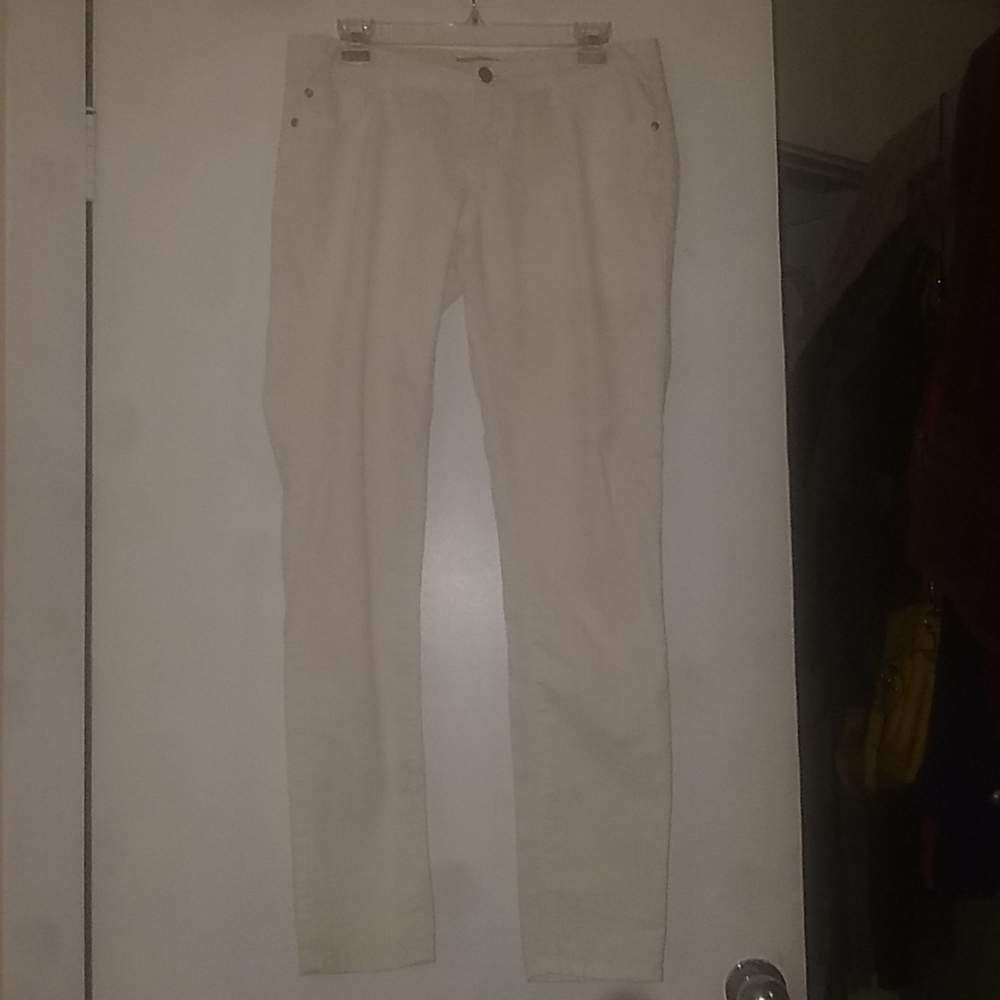 White thin jean pants. Can't find size but I'm a 4 now and they are a size too big.