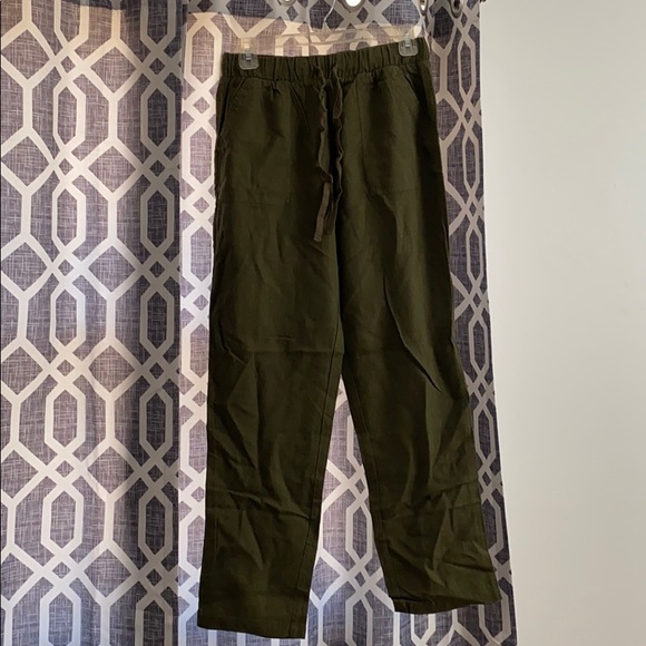 Never worn green olive pants. Great for summer and relaxing. Side and back pockets with string to tie